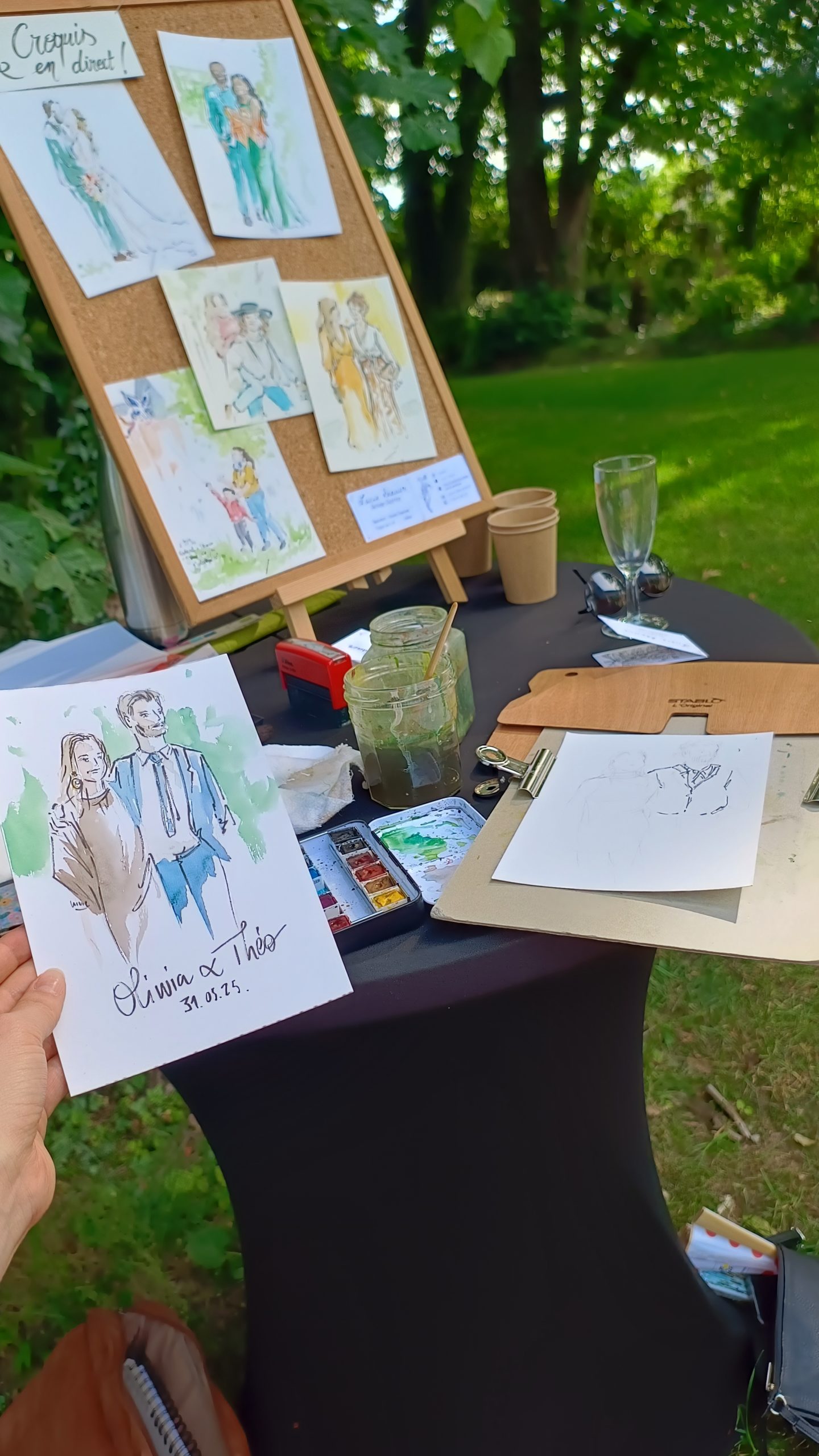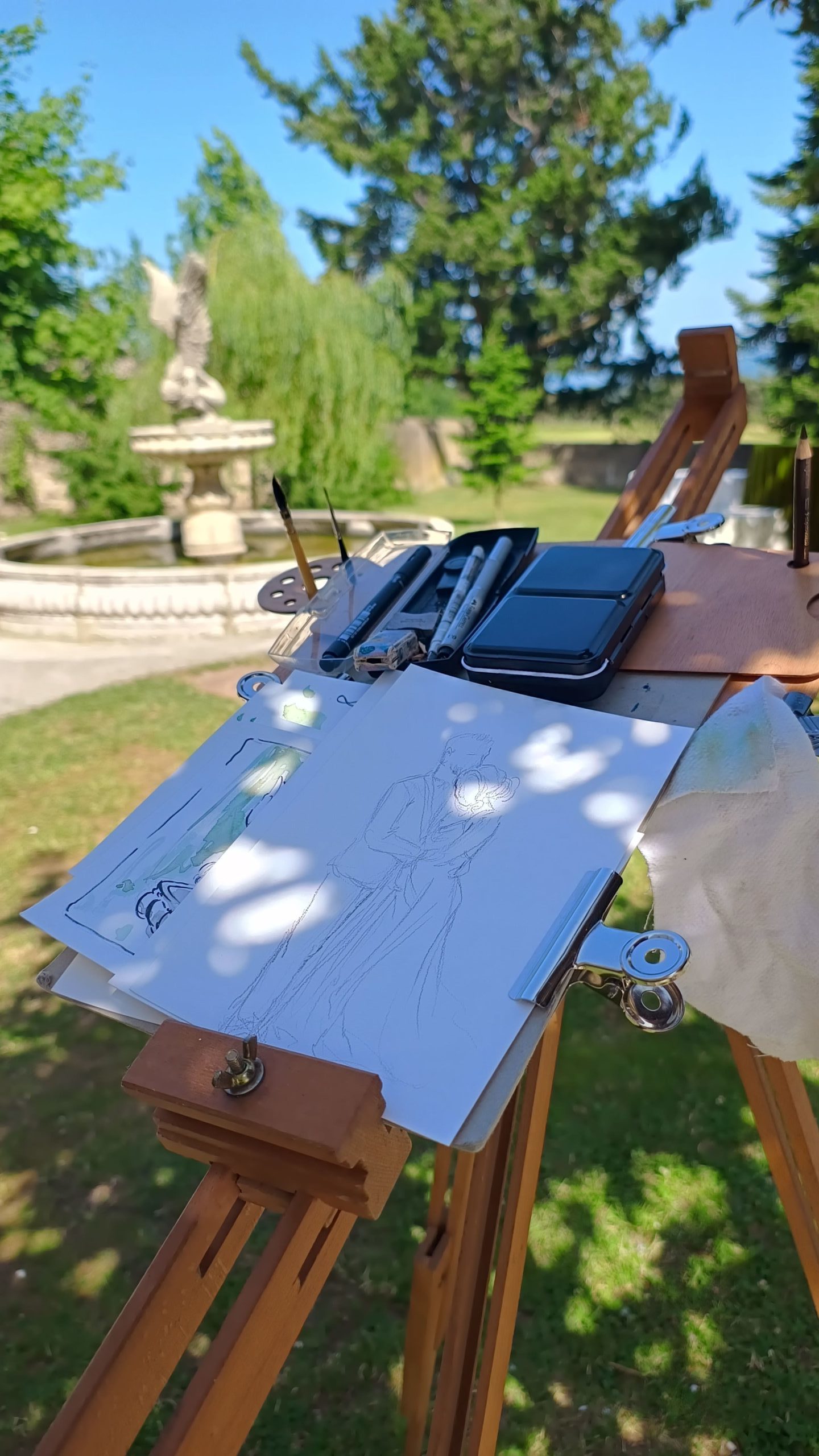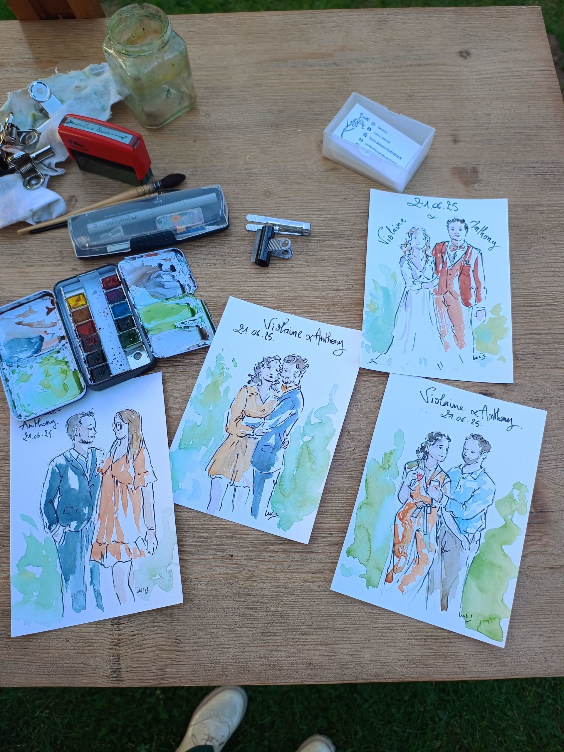 Je prends en compte tout le matériel, et la prestation peut être adaptée à vos besoins spécifiques (temps sur place, formats, petite note souvenir sur les croquis etc.).