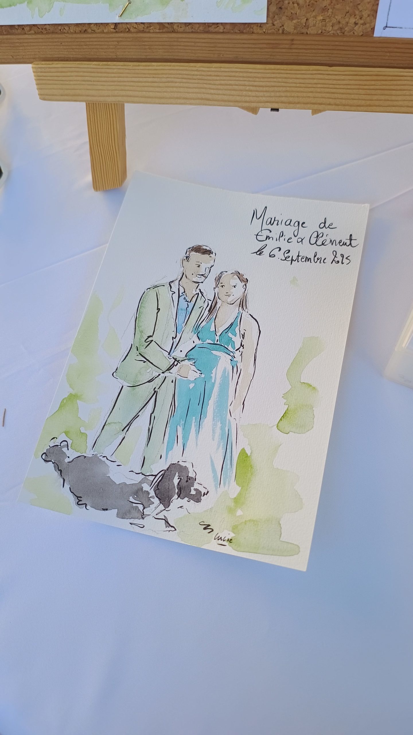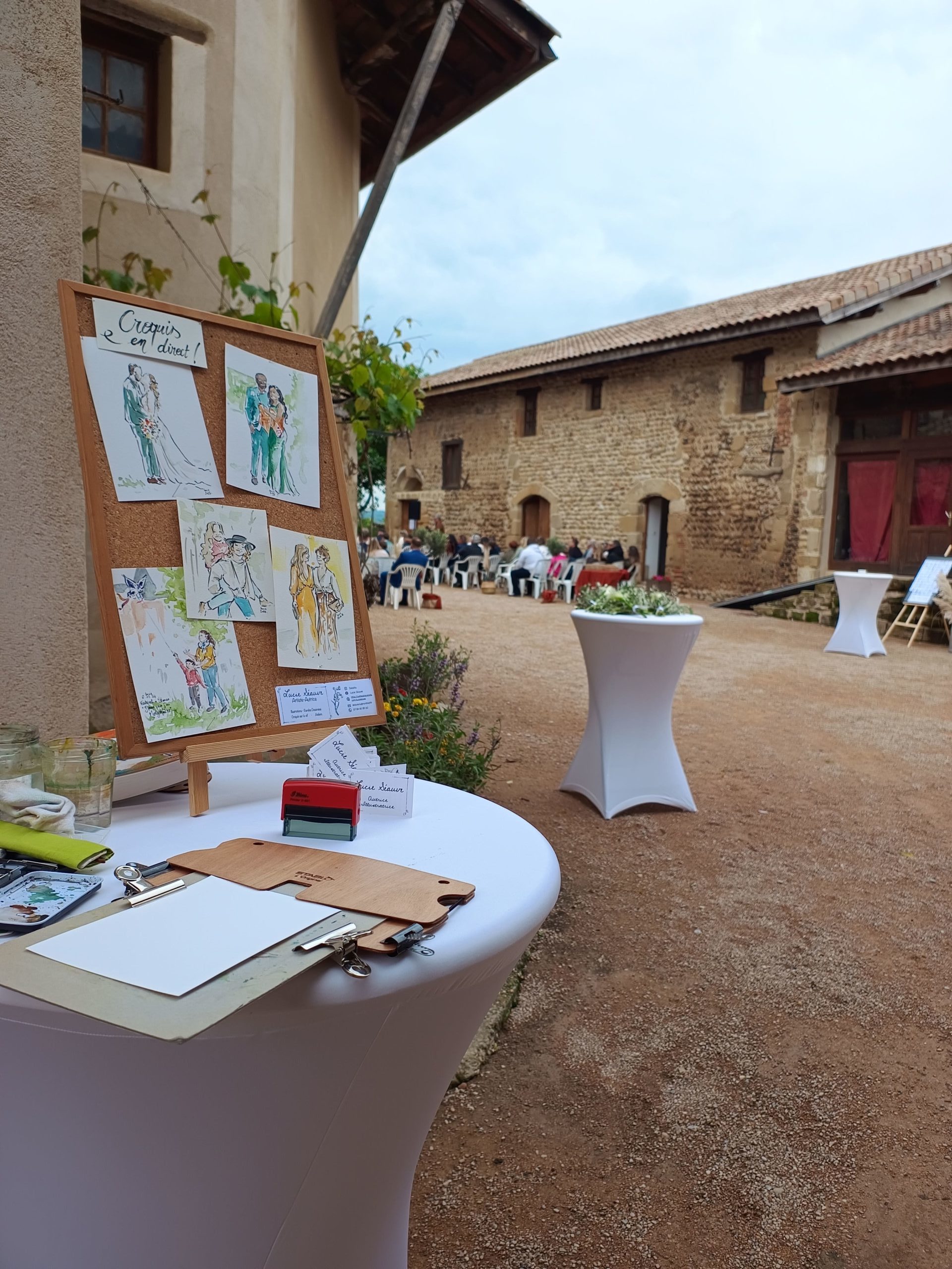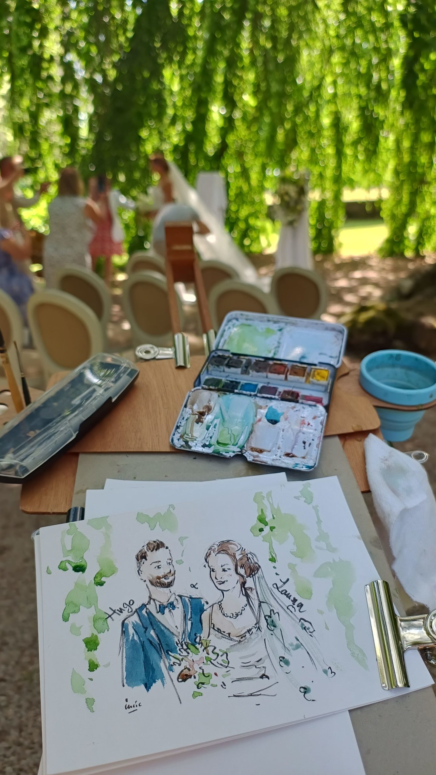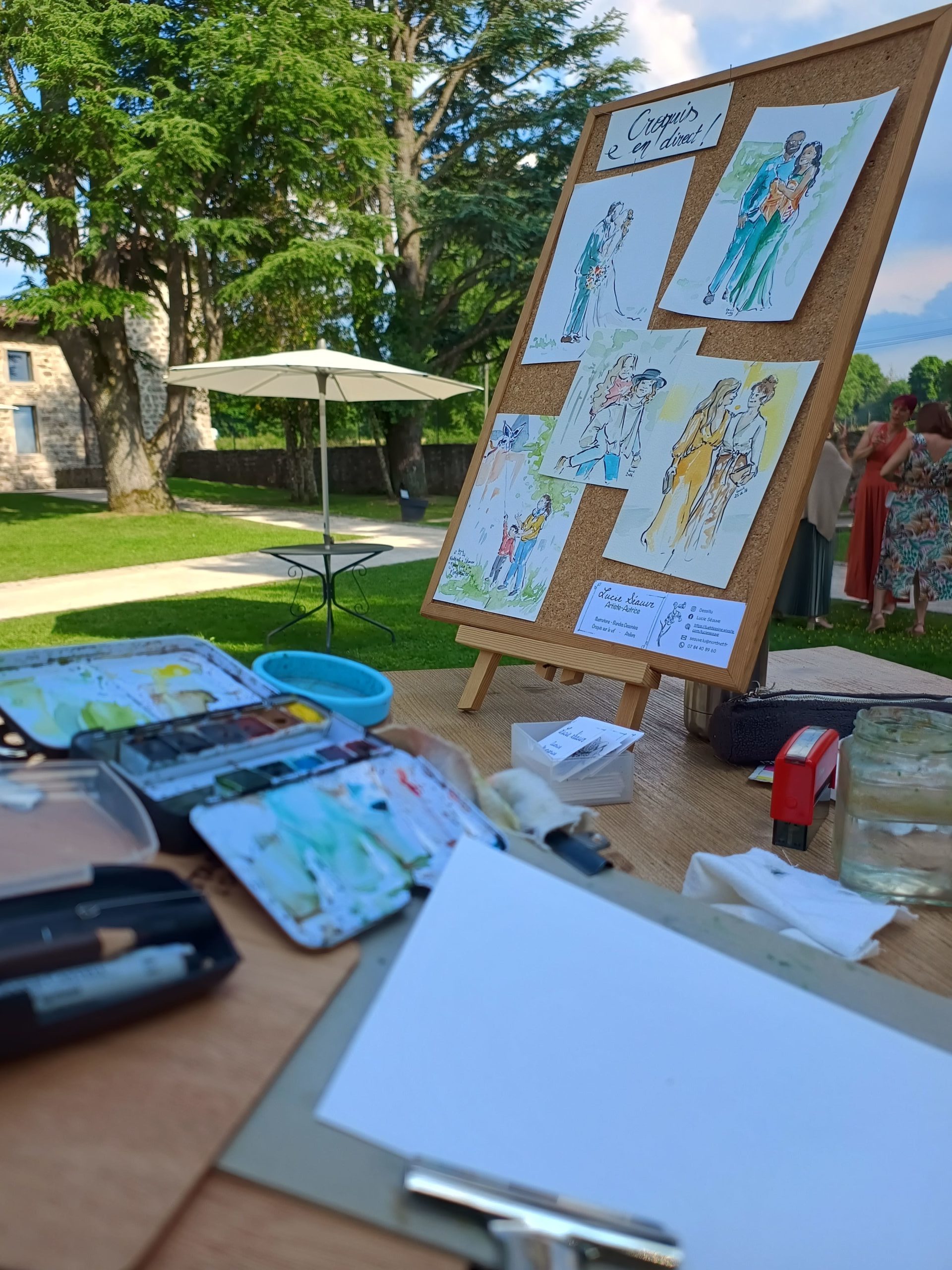 Je prends en compte tout le matériel, et la prestation peut être adaptée à vos besoins spécifiques (temps sur place, formats, petite note souvenir sur les croquis etc.).